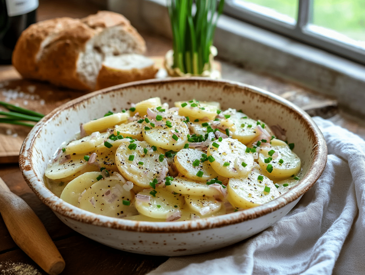 Austrian Potato Salad, or “Erdäpfelsalat”, is a beloved dish hailing from Austria, celebrated for its delicate balance of flavors and simplicity. This quintessential side dish exemplifies Austrian cuisine’s approach to elevating humble ingredients into recipes that are both refined and approachable. Known for its tangy, slightly creamy dressing and tender slices of potatoes, this salad provides a perfect harmony of textures and tastes. Whether served alongside rich meats, grilled sausages, or even as part of a hearty vegetarian plate, Austrian Potato Salad is a versatile, crowd-pleasing addition to any meal.
