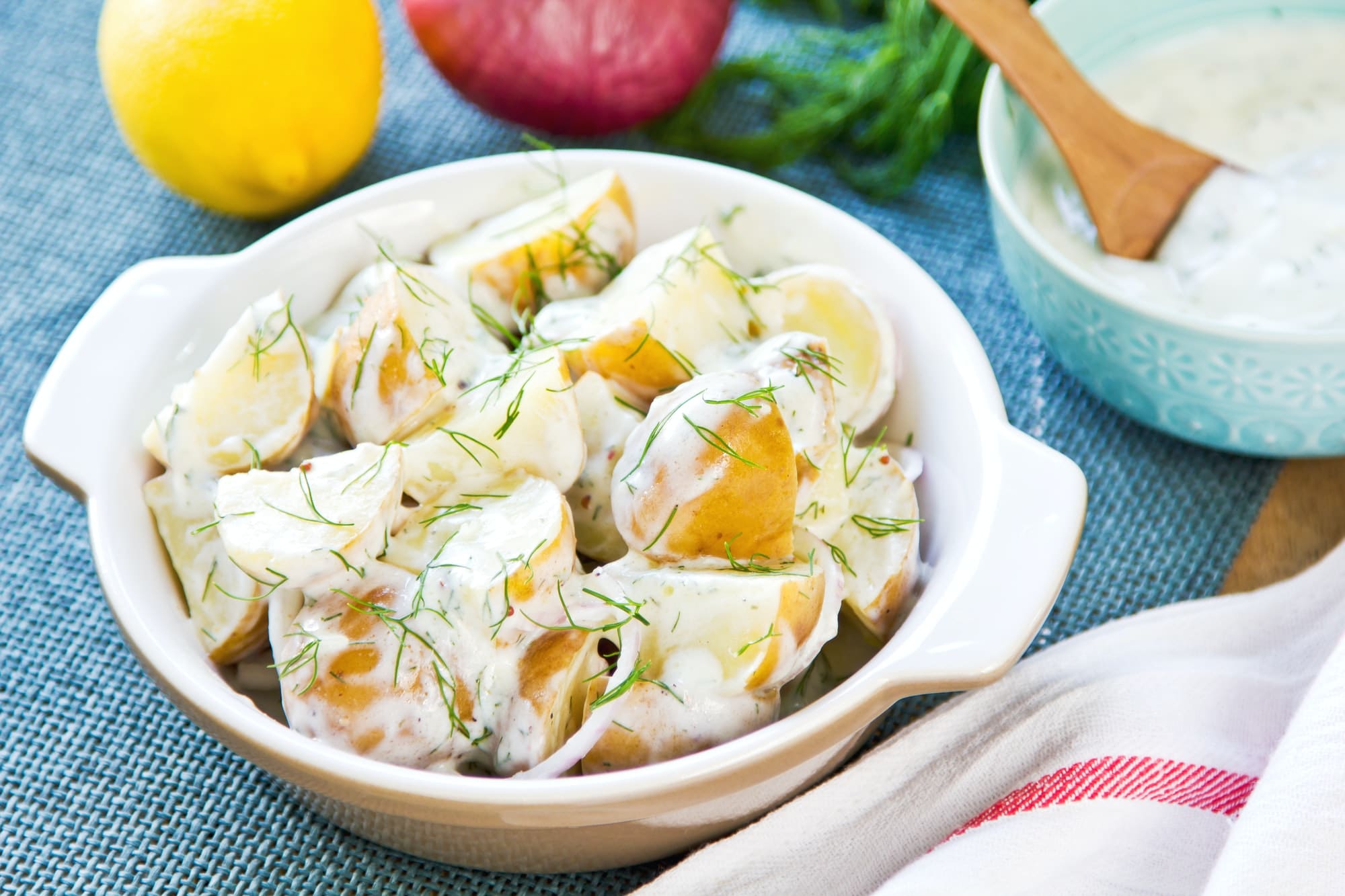 - Mix all the ingredients and keep the potato salad in the fridge until ready to serve.