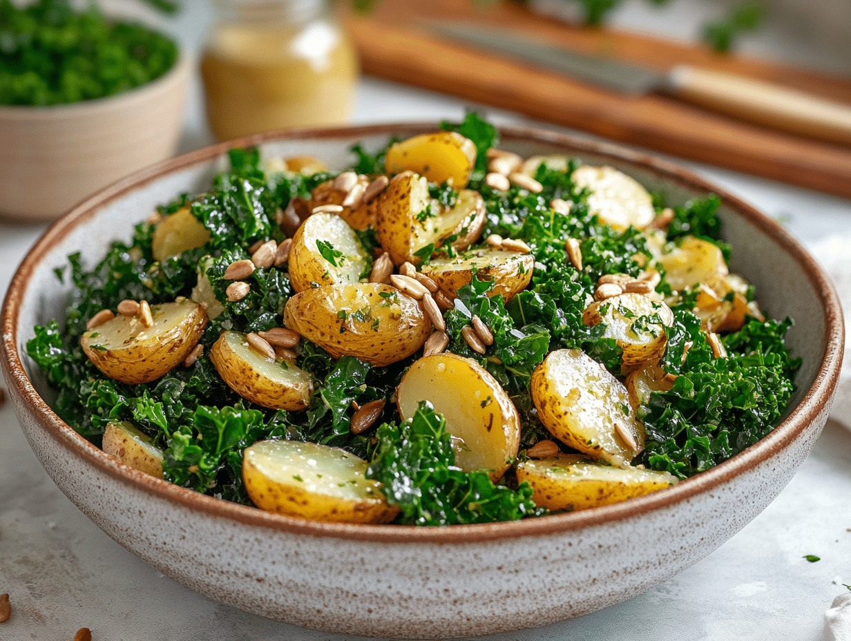 - In a large bowl, combine the sautéed kale, cooked potatoes, and sunflower seeds. Drizzle the dressing over the salad and toss gently to coat.