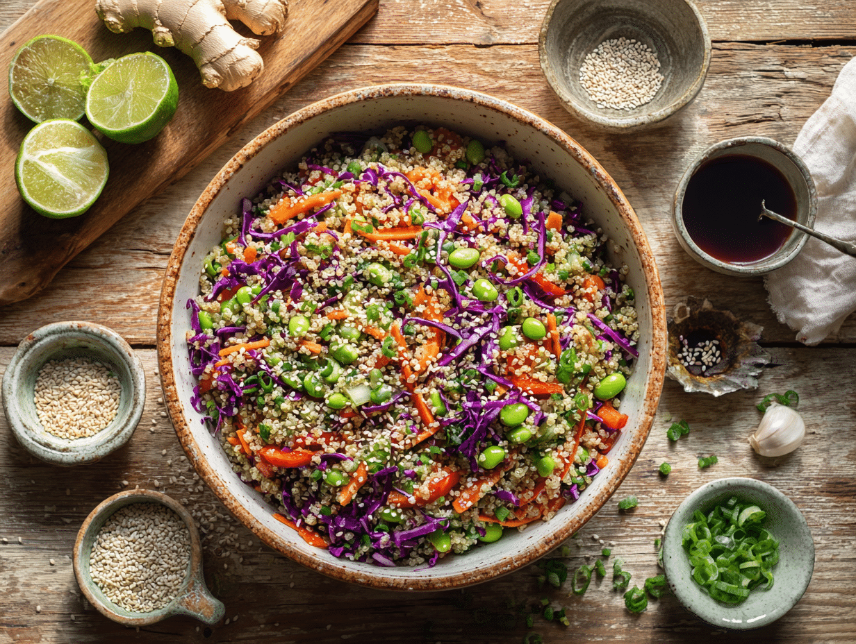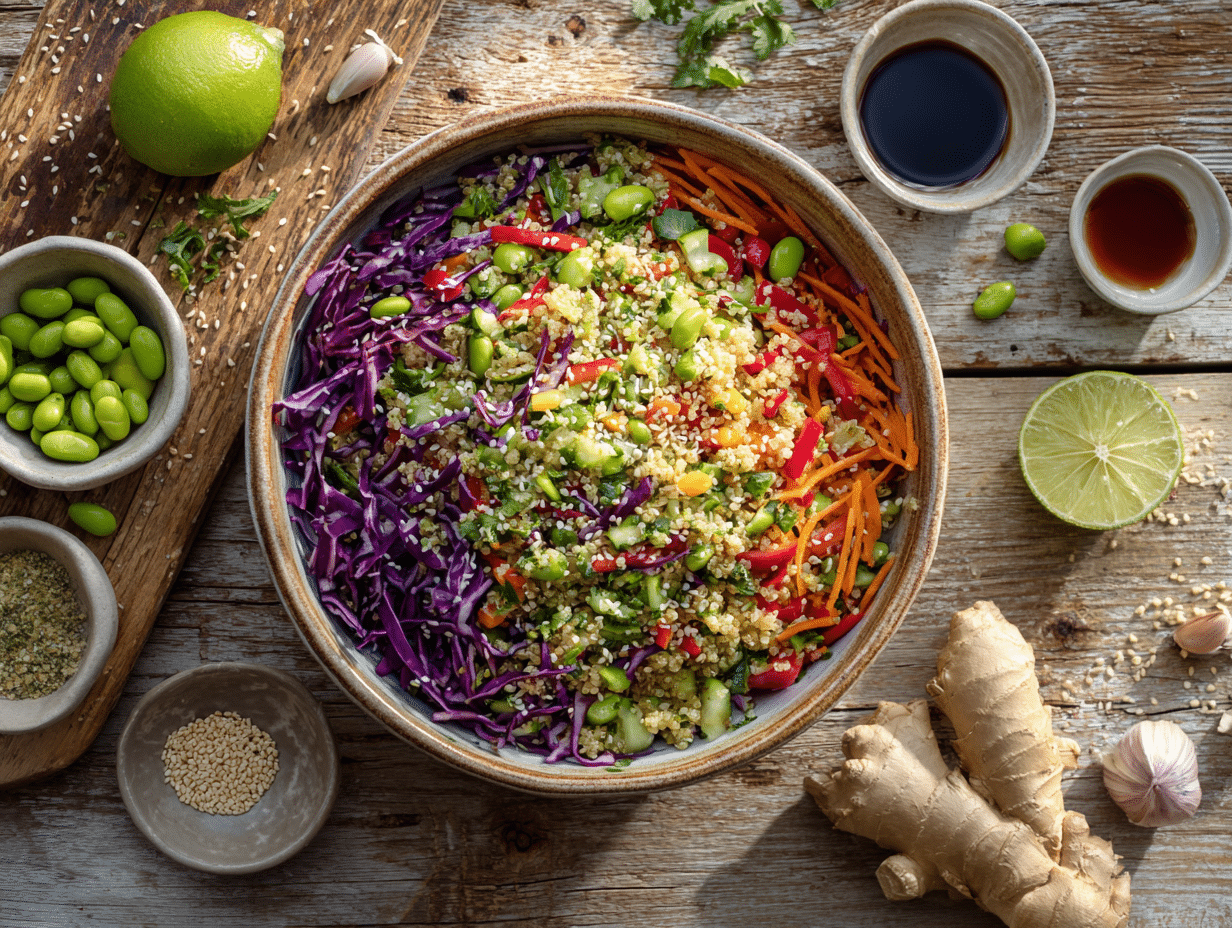 But the brilliance of this dish comes not just from the dressing, but from the way every component contributes contrast and synergy with the next. Red cabbage offers crunch and vivid color, carrots and bell pepper lend sweetness, while edamame and scallions bring a soft, green nuttiness. The cucumber adds cooling freshness that plays counterpoint to the heat of the ginger and red pepper flakes. Tossed all together with fluffy, nutty quinoa as the base, the salad becomes a textural and visual mosaic—eye-catching, satisfying, and energizing.