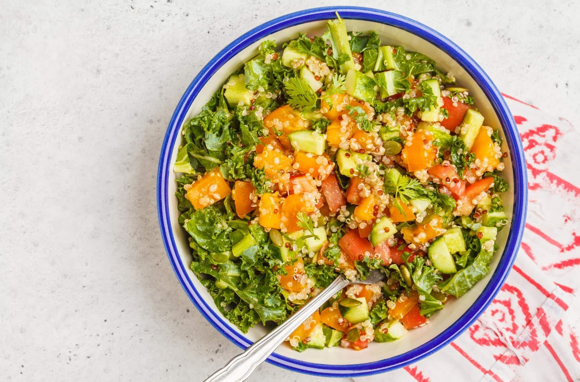 Healthy Kale Quinoa Salad. Happy Wednesday, everyone! Today I made a wicked quinoa salad, and I’d like to share the recipe with you. Quinoa is a great whole-grain carbohydrate source that can be prepared in bulk and stored for the week. I love its versatility! You add a ton of veggies, spices, and legumes to jazz it up with flavor.