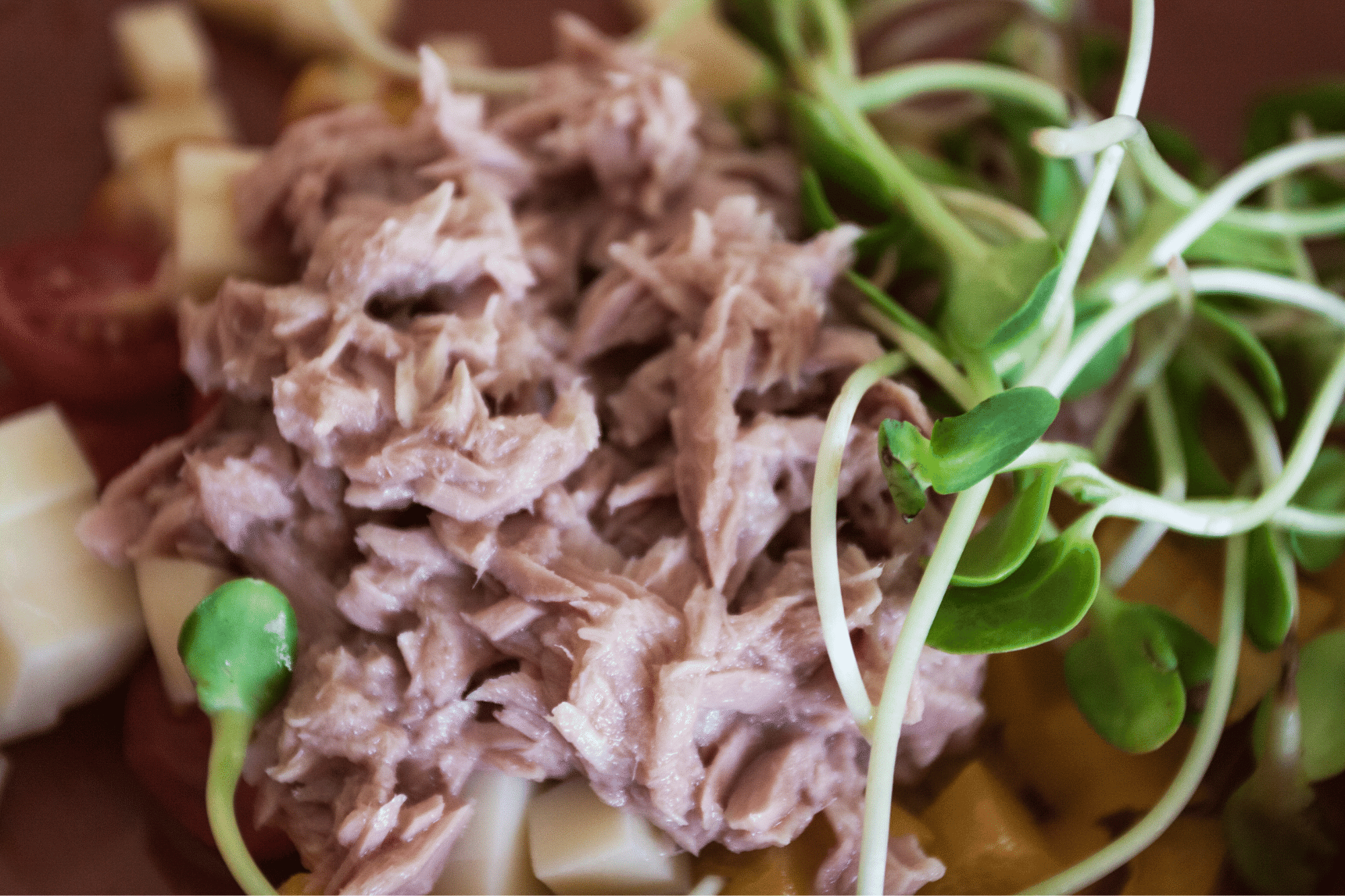 - Combine the chopped avocado, celery and onion with the alfalfa sprouts. Use a fork to flake the tuna fish on top. Mix well, but be careful not to mush up the avocado.