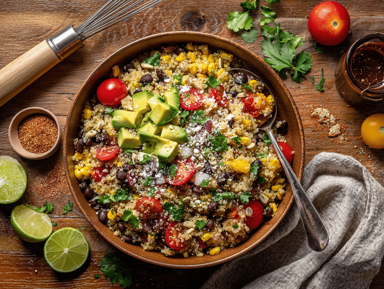 The lime-based dressingโa zesty mix of lime zest and juice, olive oil, honey (or agave), and warm spicesโacts as a brightening force that lifts the dish and ties all the ingredients together. The blend of cumin and chili reflects spice blends found in traditional adobos and dry rubs, with garlic and paprika giving the salad depth and character. This dressing not only seasons the vegetables but is also absorbed by warm quinoa, allowing the flavors to deepen as the salad chills.