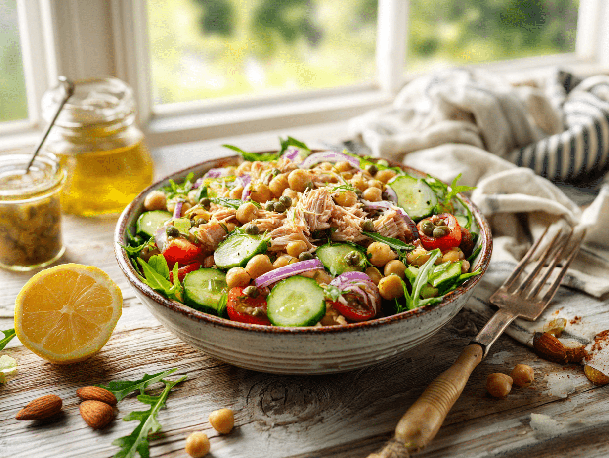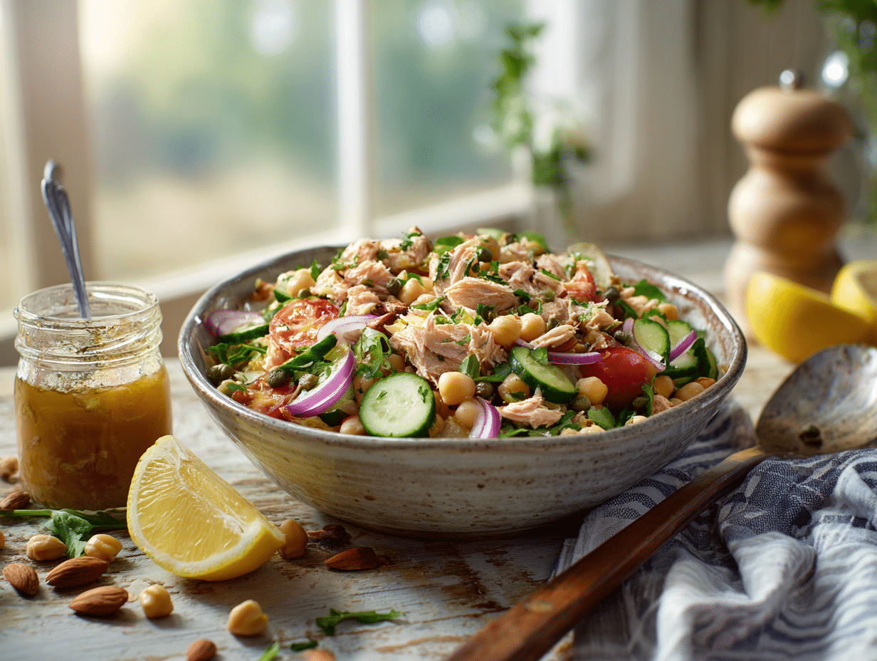 The Chickpea and Tuna Power Salad is a vibrant celebration of Mediterranean pantry cooking—thoughtfully composed to combine nutrition, flavor, and texture in every bite. Rooted in timeless culinary traditions of the Mediterranean region, this recipe draws inspiration from the hearty, nourishing, and satisfying pairings of ingredients commonly found in the coastal diets of Italy, Greece, and the Levant. Think of classic dishes like tonno e ceci (Italian tuna with chickpeas), mezze-style chickpea salads, or Provençal-style tuna combinations—each emphasizing bold yet simple flavors from humble, shelf-stable ingredients.