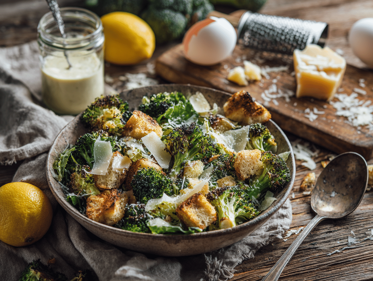 The Roasted Broccoli Caesar Salad isn’t just a fresh twist on a classic—it’s a conversation between tradition and innovation, with a strong nod to culinary history and modern palates. At its root, this vibrant dish pays homage to one of the most iconic salads of all time: the Caesar salad, famously attributed to Caesar Cardini, an Italian-American restaurateur working in Tijuana, Mexico, during the 1920s. His original version was a tableside spectacle—simple yet sophisticated, built from whole romaine leaves, a creamy emulsified dressing of egg, Worcestershire, garlic, and Parmesan, and crowned with crunchy croutons.