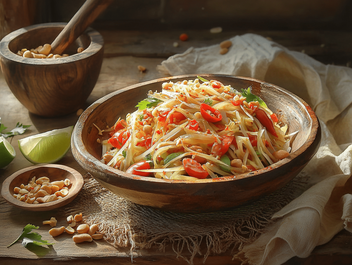 Tam Mak Hoong, also known as Lao Green Papaya Salad, is one of the most iconic dishes in Lao cuisine. This refreshing, spicy, and tangy salad represents the perfect balance of flavors and textures—crunchiness from the shredded green papaya, umami from fermented fish paste, sweetness from palm sugar, tanginess from lime juice, and a fiery kick from Thai bird’s eye chilies.