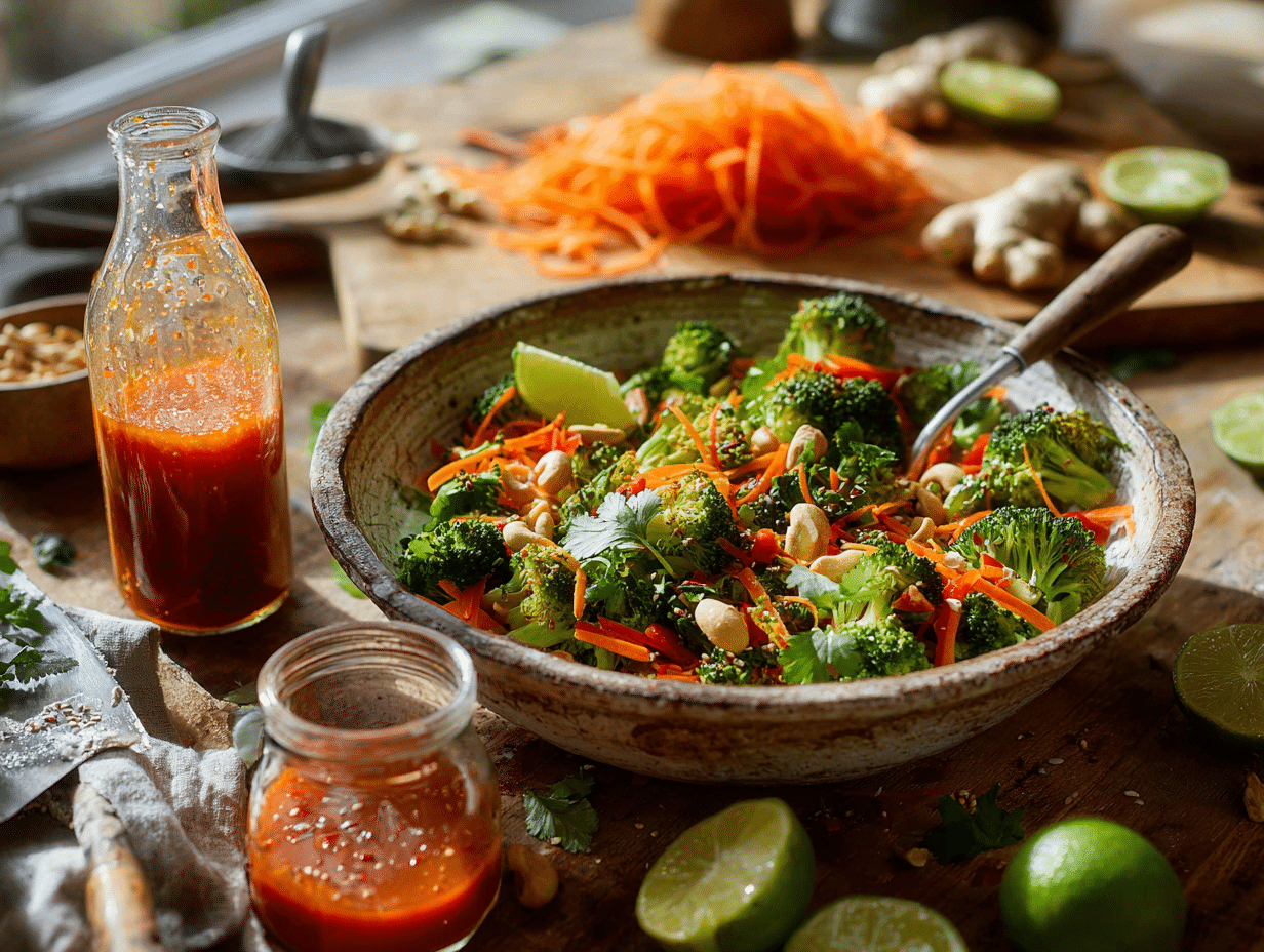 The roots of the recipe lie in the revered Thai-style Sriracha sauce, a condiment originally from Thailandโs Si Racha province. The American adaptationโmade famous by Huy Fong Foodsโhas become a culinary staple in countless households worldwide. Here, itโs tempered with fresh lime juice, unseasoned rice vinegar, and a touch of honey to build a dressing thatโs at once spicy, tart, sweet, and umami-rich. Toasted sesame oil adds nuttiness, while subtle aromatics like garlic and ginger deepen the complexity. This dressing doesnโt just coat the ingredientsโit soaks in, bonding with the textures of blanched broccoli and tender carrot ribbons.